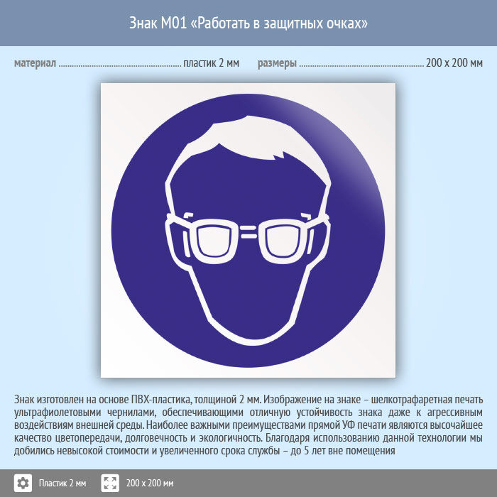 Знак M01 «Работать в защитных очках» (пластик, 200х200 мм) в Наро-Фоминске купить