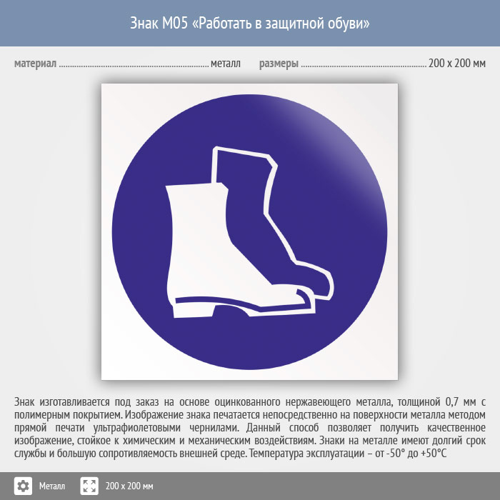 Знак M05 «Работать в защитной обуви» (металл, 200х200 мм) в Наро-Фоминске купить