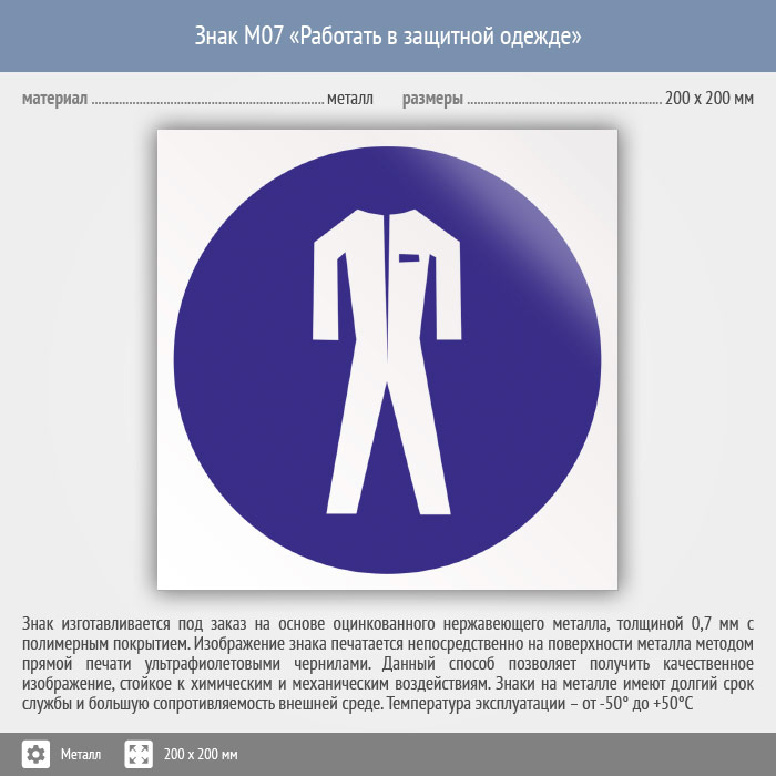 Знак M07 «Работать в защитной одежде» (металл, 200х200 мм) в Наро-Фоминске купить