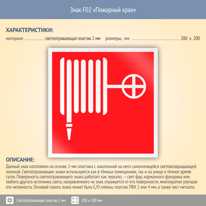Знак F02 «Пожарный кран» (светоотражающий пластик, 200х200 мм) в Наро-Фоминске купить